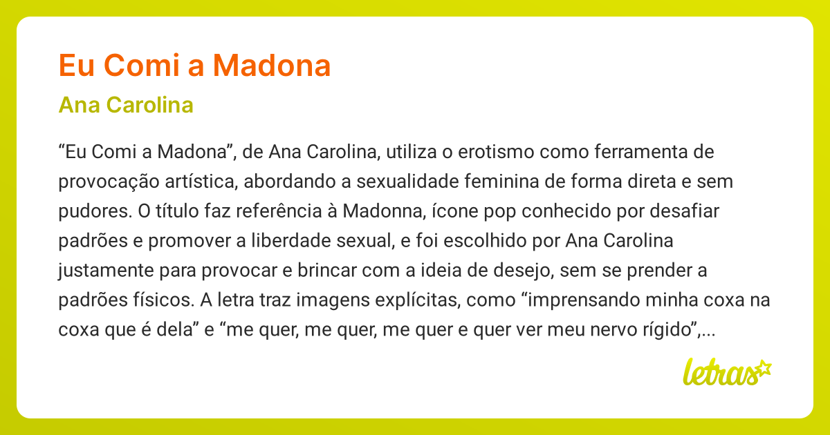 A música ‘Eu Comi a Madona’ de Ana Carolina é uma celebração da sensualidade e da liberdade sexual. A letra é explícita e carrega uma forte carga erótica, explorando o desejo e a intensidade das relações íntimas. A narrativa é conduzida por uma voz feminina que descreve uma experiência sexual intensa e libertadora, onde o prazer e a entrega são os protagonistas. A repetição de frases como ‘me quer, me quer, me quer’ e ‘fui eu quem bebi, comi a madonna’ reforça a ideia de posse e domínio, mas também de reciprocidade e consentimento.