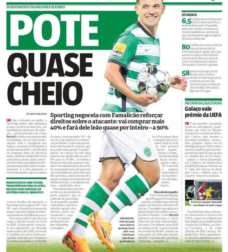 Para pensar numa venda do PG se de facto se se concretizar esses 90%, com os atuais 50% que o SCP não compensa vender, mesmo que fosse pela clausula. embora um negocio nunca fosse mau financeiramente, se dessem 80, o SCP receberia 40, quando pagou 6,5 por 50%.
