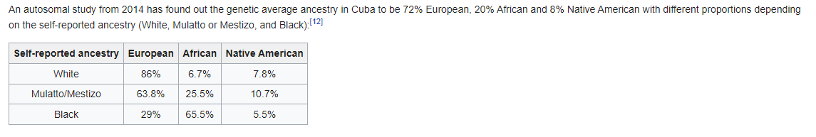 Mas sim os vários dados genéticos sobre Cuba indicam que como um todo a maior parte do perfil genético é Europeu vindo de Espanha, sendo depois Africana e muito pouco indígena que foi logo à vida nas primeiras décadas de contacto com os Espanhóis.