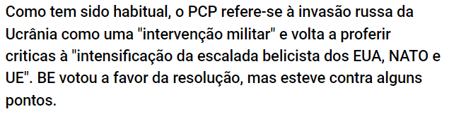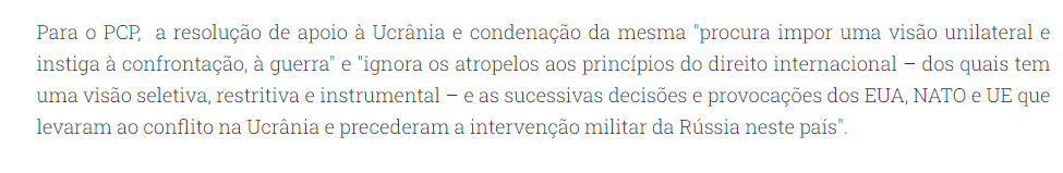 É possível dizer que a solução não é apoiar a ucrânia, que não é sequer " resoluções de condenação" nem “sanções económicas”. Mas então é o quê? Pois isso eles não dizem, porque à boa moda comuna criticar é fácil, dizer disparates fantasiosos mais ainda, mas apresentar soluções concretas é que tá de chuva.