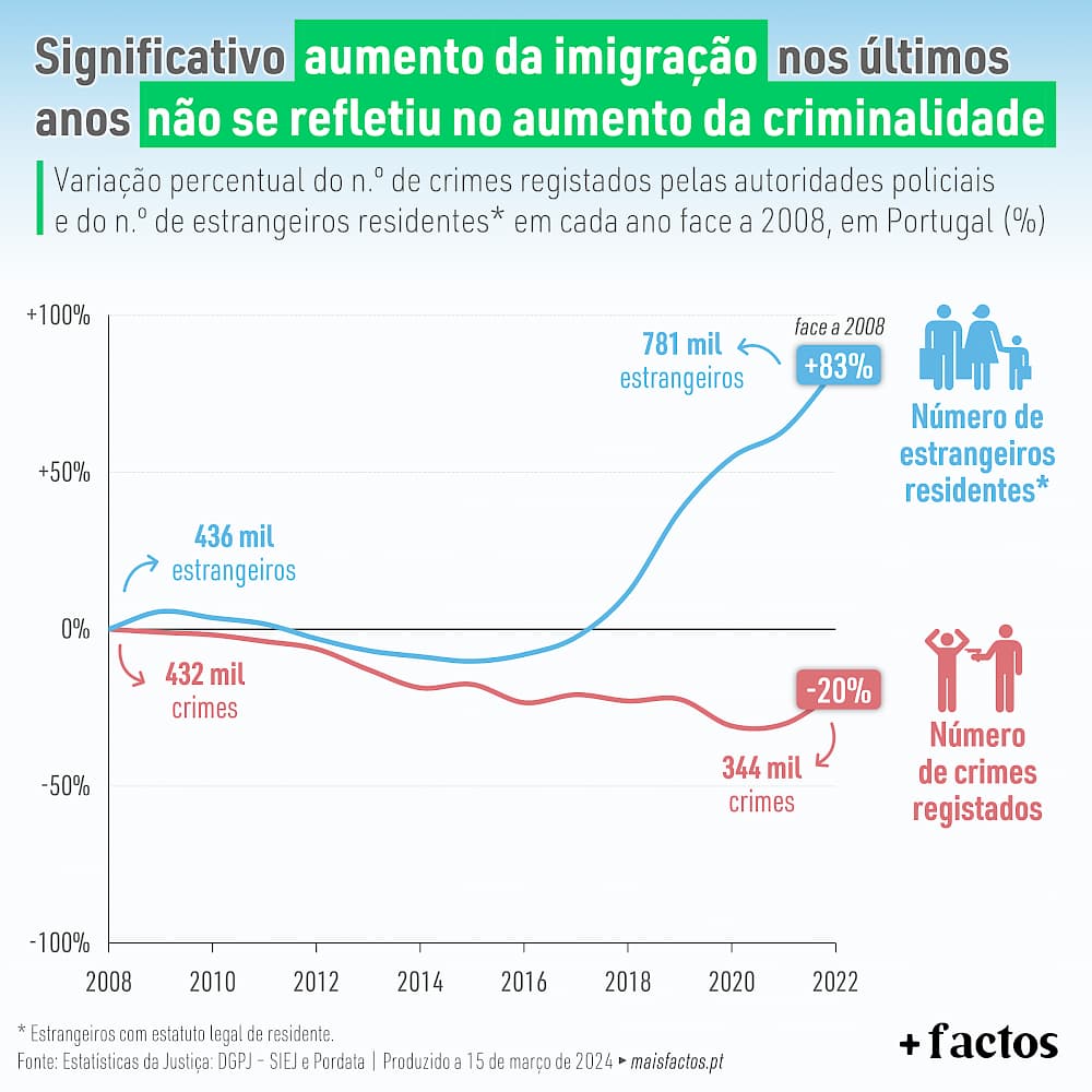 Ha aqui varios factos. Primeiro, se eu olhar para o grafico apenas no periodo que eu quiser, posso dizer que ate 2015 menos imigrantes representaram menos criminalidade e que o aumento exponencial de imigracao a partir de 2021 levou a inversao de uma tendencia de diminuicao de criminalidade e um aumento. Portanto isto cada um pode pegar nos dados atuais e ‘ajusta-los’ como bem entender.