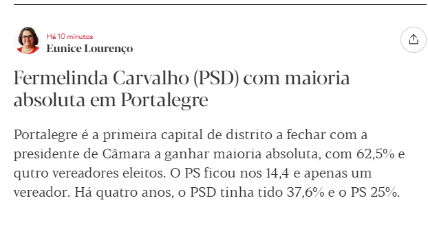 A tentativa de colagem ao lider correu muito mal…alias basta ver que todos os deputados chega que concorram, todos foram derrotados. A historia das 30 camaras foi um tiro no pe. Os tais “basteos" do chega: ribatejo..alentejo e algarve…ate ver foram 3 derrotas enormes (vamos ver o resultado final no algarve). A diminuicao para, possivelmente, metade da percentagem total no partido nao deixa duvidas: para ja o chega nao e um partido local e autarquico. E verdade que passar de quase zero para 12/15% e bom..isso e verdade. Mas tb o BE teve um alcance “interessante" nas 1 autarticas que concorreu!!