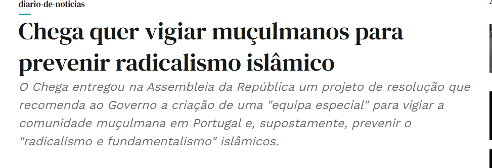 o partido chega não esconde propriamente a sua intenção: é um partido que desconhece as garantias constitucionais de liberdade religiosa e de estado laico. na cabeça do partido chega Portugal é um pais exclusivamente branco e católico. defende políticas e práticas inconstitucionais, contra a carta dos direitos humanos e inventa frequentemente pseudo dados sobre esta comunidade.
