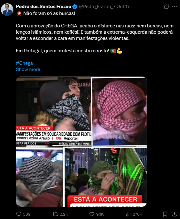 o próprio deputado que já mentiu inúmeras vezes com dados fantasiosos sobre o número de refugiados muçulmanos canta vitória generalizando a outros símbolos muçulmanos; revelando no fundo a intenção que é óbvia mas que o cidadão sombra, que nunca poupa na qualificação dos outros como limitados, unidimensionais, burros, ainda não tinha apanhado da onda de partidos “dos valores cristãos”.