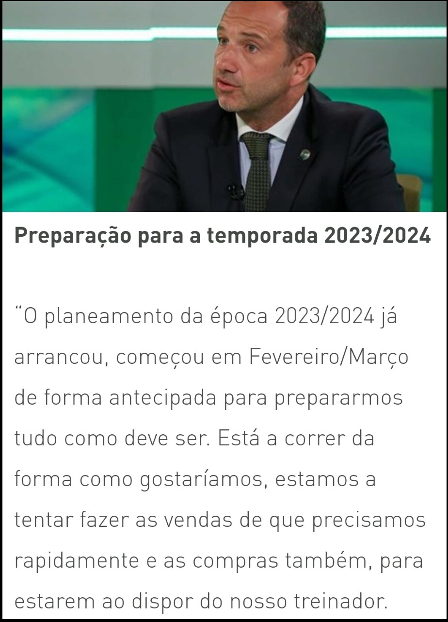 O tópico de preparação da época 2023/2024 foi aberto há 11 meses, aqui no fórum, todos percebemos o descalabro que ia ser a época transata, de tão bem preparada que foi. Entretanto, no clube, ao contrário do fórum, aparentemente ainda não começaram a preparação da época (que já se fala neste fórum há 11 meses). Ainda tem que falhar todos os alvos de contratação primeiro (parece que é só o Gyokeres) e depois logo se vê (indo buscar jogadores de 2º plano).