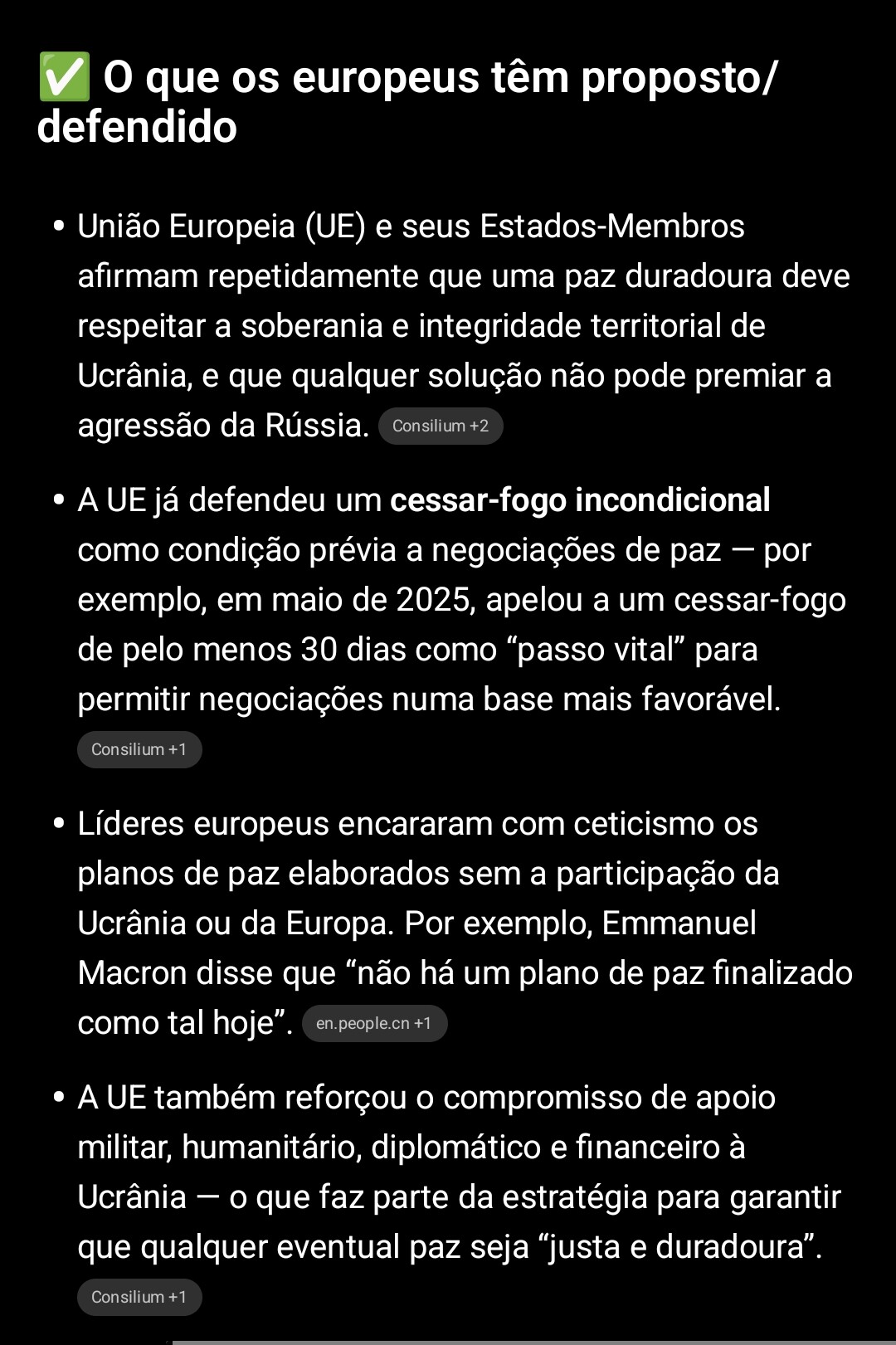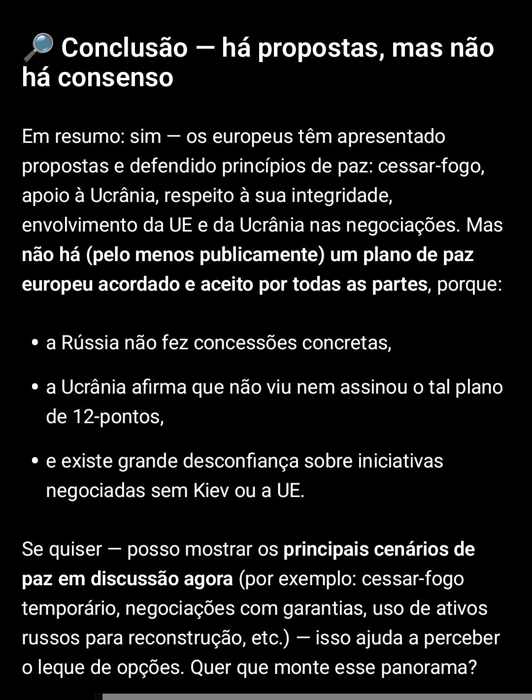 No plano europeu + ucraniano: cessar fogo imediato; o exército ucraniano teria que ter 800 mil; em relação à NATO a decisão estaria sempre dependente dos membros da aliança; no ponto dos territórios as linhas da frente do conflito seriam congeladas para no futuro, e sem ser através dos meios militares, haverem negociações entre ambos os países…a parte do Donbass que a Ucrânia controla continua sob o poder ucraniano; utilização dos activos russos para reconstrução da Ucrânia; garantias de segurança serem similares ao artigo 5º da NATO; eleições na Ucrânia quando for possível; não haver amnistia para os crimes de guerra cometidos