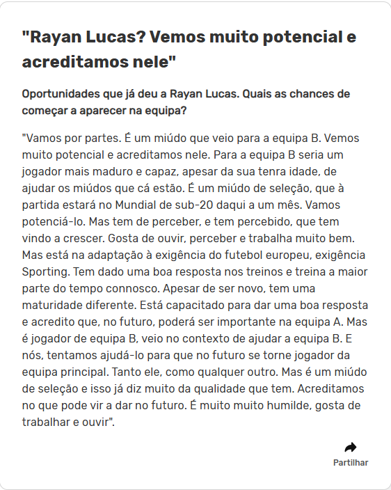 “O Rayan veio para a equipa B, não para a A. Vemos-lhe muito potencial e acreditamos que, num primeiro momento, pela exigência da B, seria mais maduro e capaz de ajudar, apesar da tenra idade, os miúdos que estão no Sporting. É um miúdo de seleção, deverá estar no Mundial sub-20 e vemos potencial, mas ele tem de perceber e tem percebido - tem crescido, gosta de ouvir e tem trabalhado bem - mas está habituar-se à exigência do futebol europeu e do Sporting. Tem dado boa resposta e treina a maior parte do tempo connosco porque tem uma maturidade diferente e acredito que no futuro seja importante na A, mas é um jogador que veio num contexto de equipa B para no futuro se tornar num jogador da equipa principal, tal como qualquer outro da equipa B, mas só ser jogador de sub-20 da seleção do Brasil já diz muito da sua qualidade. Miúdo muito humilde e que gosta de trabalhar, ouvir e aprender”