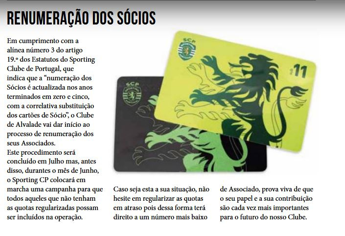 Na edição n.º 3777 do Jornal Sporting, os leões anunciaram que, em julho, irão proceder à renumeração dos seus Associados, de acordo com a alínea número 3 do artigo 19.º dos Estatutos do Clube