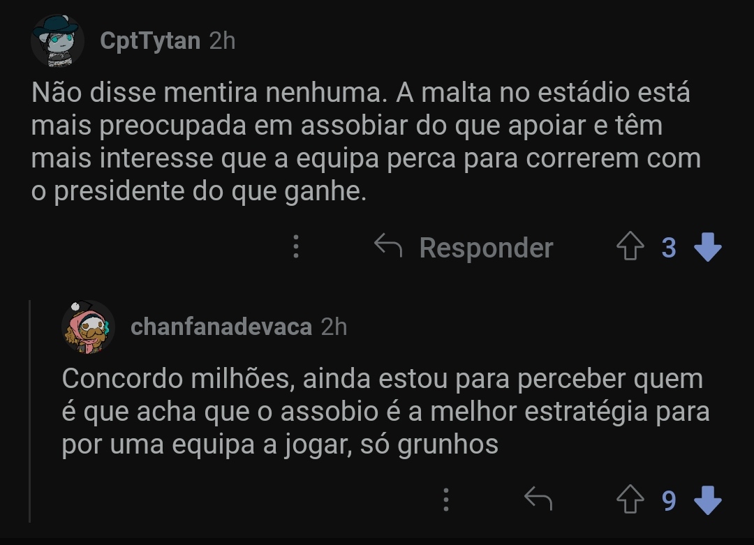 Estou banido nas 2 contas. A última porque há um pateta delusional que só inventa tretas sobre as claques para difamar.