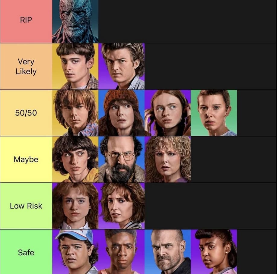Obviamente que o Hopper não pode morrer. Aliás, nesta season há a cena em que parece que vai acontecer, mas toda a gente sabia que é estúpido ‘ressuscitar’ um personagem morto para o matar mais tarde. Pela mesma lógica, não me parece que o Will morra. A Max também, se fosse para morrer, já teria morrido. A Karen, a mesma coisa… O Steve, o Jonathan, a Joyce ou o Murray, não me parece. Curiosamente, apostaria numa dessas duas ‘Low Risk’ para serem a tal ‘morte chocante’, se acontecesse. O Mike e a Eleven apostaria os dois testículos em como não morrem, porque terão de ser felizes para sempre, como todo o personagem dos anos 80.