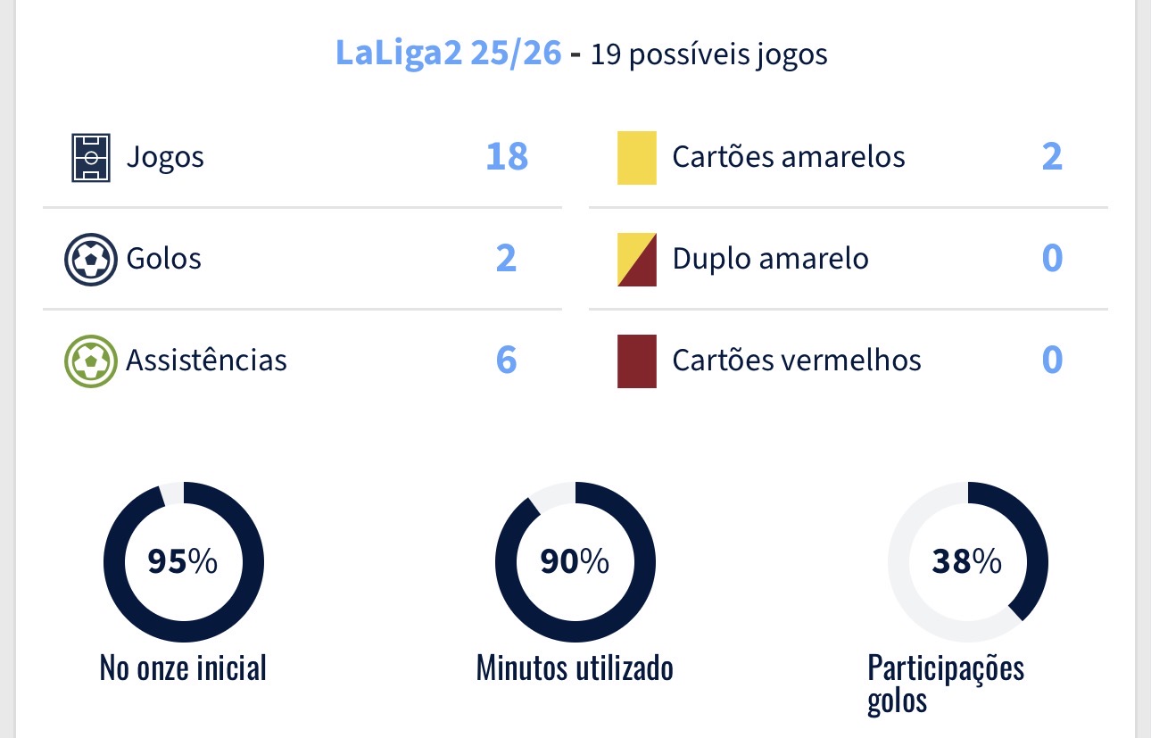 2 G / 6 A na 2ª liga espanhola em 18 jogos (para comparação, o Yeremay vai com 7 G / 5 A), 22 anos, 1.79 m.