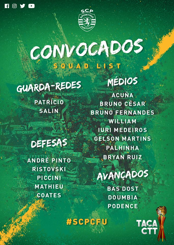 Face aos convocados ia com Salin, Ristovski, Coates, André Pinto, Bruno César, Iuri Medeiros, João Palhinha, Bryan Ruiz, Acuña, Podence e Doumbia.