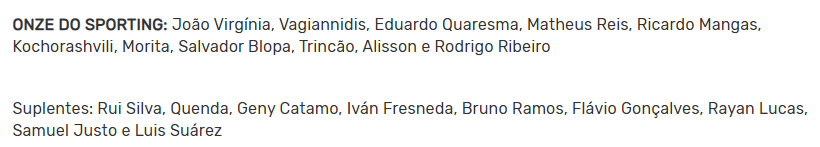 ONZE DO SPORTING: João Virgínia, Vagiannidis, Eduardo Quaresma, Matheus Reis, Ricardo Mangas, Kochorashvili, Morita, Salvador Blopa, Trincão, Alisson e Rodrigo Ribeiro