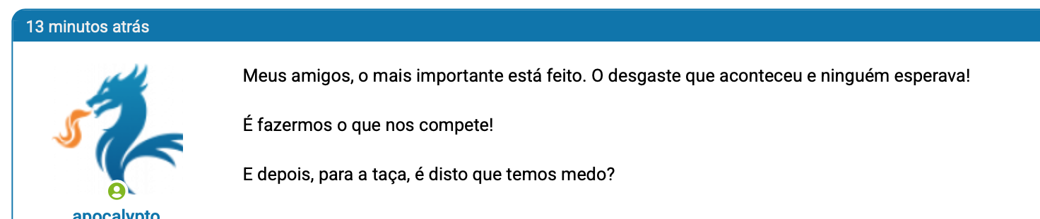 Os jogadores até acreditam, mas a jogar assim mais tarde ou mais cedo vamos ter ”azar”. Empate nos 90 minutos com o poderoso AFS, mais uma vitória sofrida… estou com um misto de emoções, feliz pela vitória mas irritado pelo o futebol praticado e pela displicência de alguns jogadores, sinceramente a forma atual da equipa não me dá garantias de trazer uma vitória do estádio dos corruptos do norte. Mas como para o mister está tudo bem e eu não percebo nada disto…