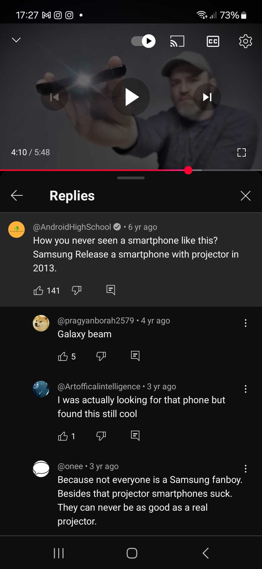 Pelo que reparei nos comentários desse vídeo parece que a Samsung já lançou um smartphone com projector, e eu não sabia.