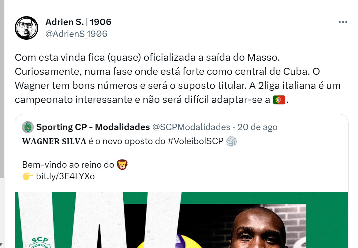 De Leão ao peito, Wagner Silva terá a primeira experiência no voleibol português. “Comecei no Brasil, já joguei em vários clubes, ganhei alguns títulos e agora tive a oportunidade de vir para o Sporting CP. Após uma conversa com o míster João Coelho, aceitei. Quero participar nesta experiência, quero conhecer o voleibol português”, vincou, dizendo aquilo que pode acrescentar à equipa verde e branca: “Trago experiência e algumas coisas de diferente que aprendi em Itália. Geralmente, no voleibol, um oposto não defende muito bem e lá a defesa é necessária, toda a gente participa, todos são muito bons na defesa e também no bloco. Vou tentar passar isso aos meus companheiros, todos eles têm outras experiências e vai ser uma troca muito positiva, que tem tudo para ajudar a equipa a crescer e a conseguir atingir os nossos objectivos”.